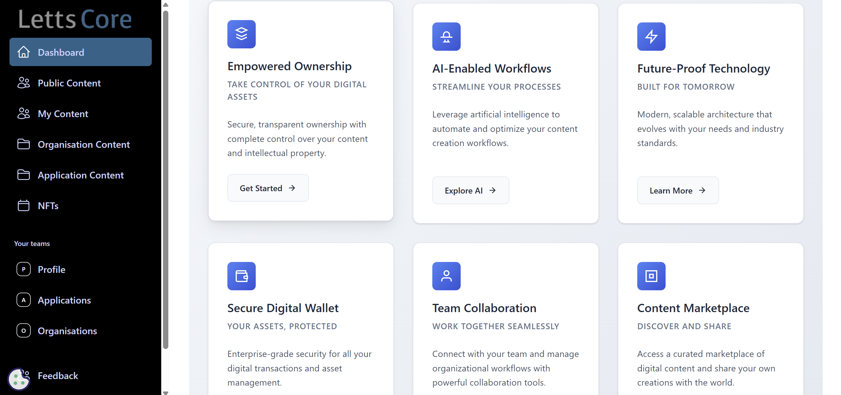LettsCore is not just a CMS - it's a Web3-powered, AI-enabled platform that enables creators, agencies, marketers, and enterprises to own, manage, distribute, and monetise content at the atomic level. Built to scale globally with lower compute costs, LettsCore transforms content into intelligent, secure, revenue-generating assets.